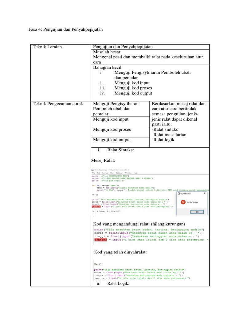 Panduan pengguna dan dokumen pustaka terdapat dalam fasa. Terdapat 3 jenis ralat iaitu. Pengujian dan Penyahpepijatan aMasalah besar Mengenal pasti dan membaiki ralat pada keseluruhan atur cara bBahagian-bahagian kecil i.