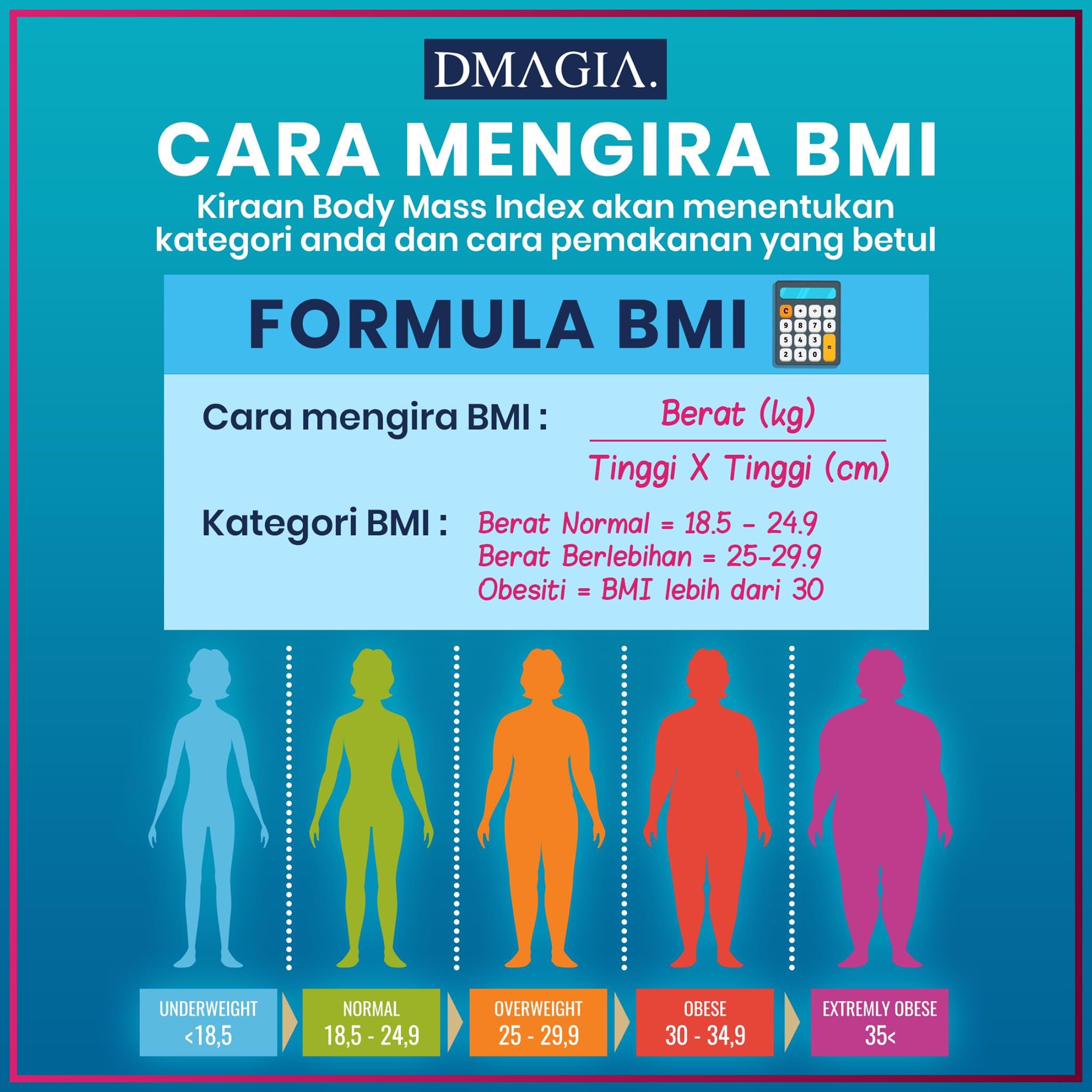 Formula BMI Body Mass Index Untuk mengira BMI secara manual gunakan formula berikut. Berat badan kg tinggi ² dalam m Contohnya jika berat badan anda adalah 65kg dan ketinggian anda adalah 160 maka cara kiraannya adalah 65 kg 16 ². Anda hanya perlu ambil ketinggian anda dalam.
